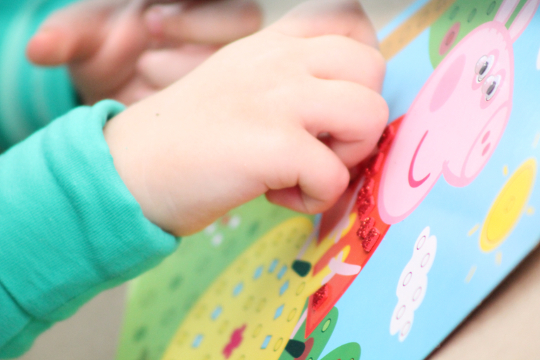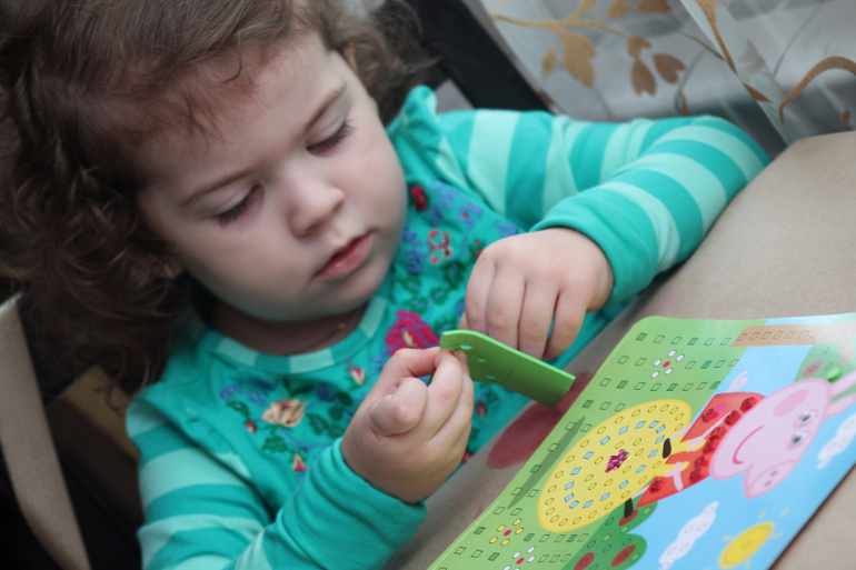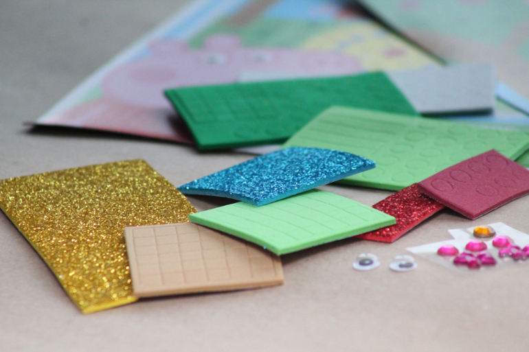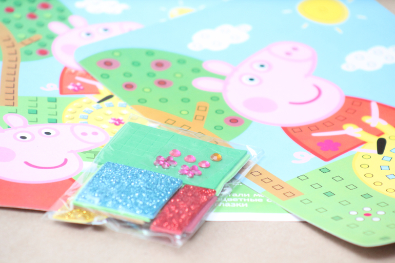 В наборе 1 картонная основа для аппликации с чудесной Пеппой так же для удобства нанесена разметка где и какая деталька должна находится!!!!!!!!!! И конечно же набор мягких самоклеющихся деталек