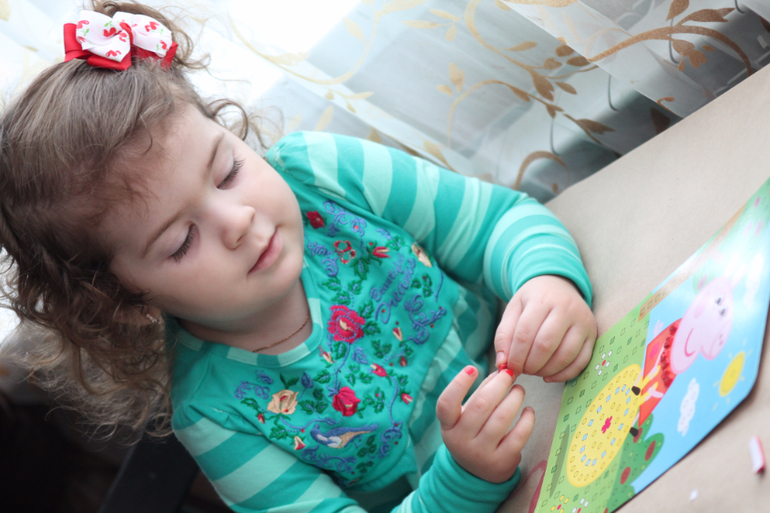 И тут началось все самое интересное....первая проба и о чудо выходит ...да еще так здорово...и так увлекательно...я только отделяю защитную ленту от клейкой основы...остальное Вареник делает сама!!!!!!!!!!!!!!! и она этим очень горда!!!!!!!!!!!!! уже полчаса сидит творит!!!!!!!!!!!!