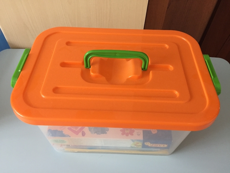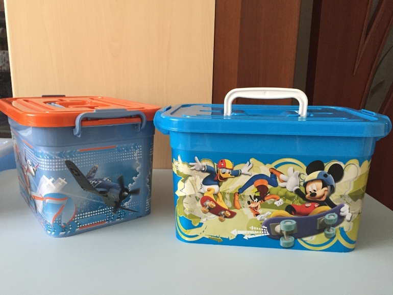 Пластик отличного качества, яркие, достаточно вместительные. На крышке есть ручка для переноски, по бокам ящик закрывается на замочки (очень крепко!).