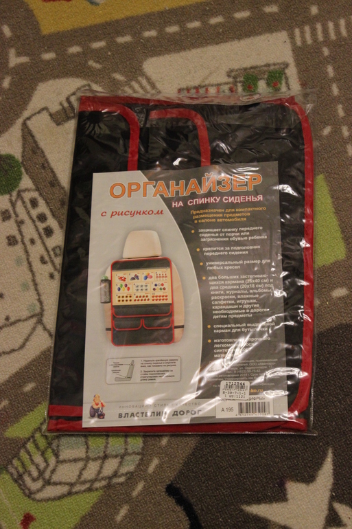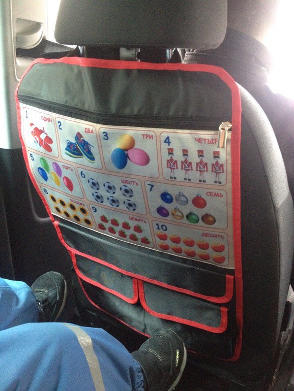 И для папы нашего тоже нашлась нужность. Органайзер на спинку сидения. Очень полезная и качественная вещь. Папа наш давно ругался, что сын пачкает спинку сидения ногами. Теперь эта проблема решена, покрытие у органайзера хорошо отталкивает влагу и грязь. В нем много кармашков, куда мы сложим наши небольшие книги и игрушки для путешествий, сбоку можно вытащить чехольчик для поильника или бутылочки. Цифры нанесены непосредственно на ткань, рисунок яркий и понятный. Очень довольны покупкой.