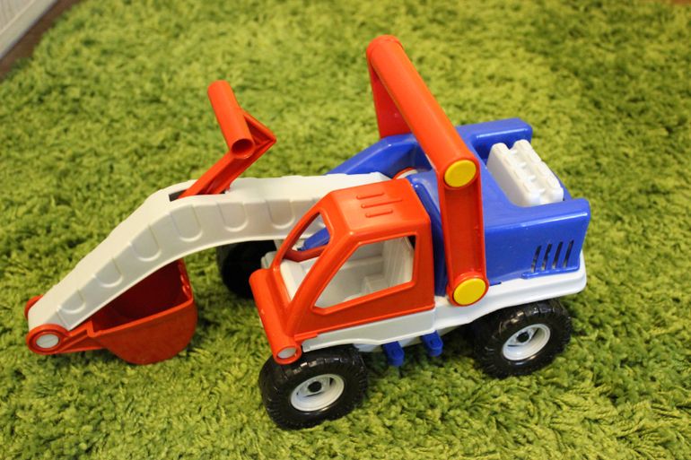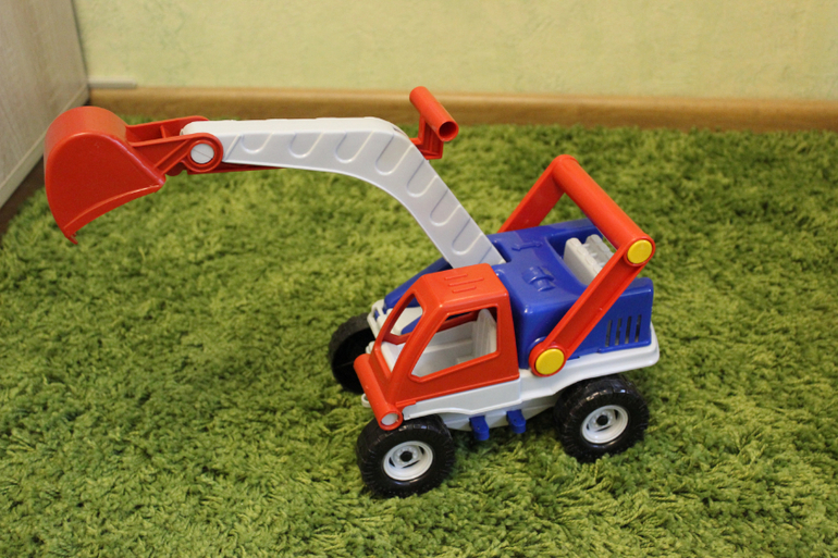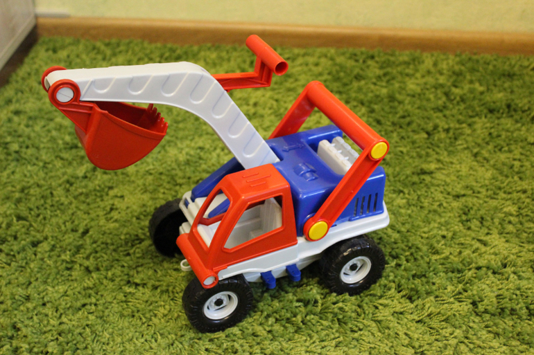 Наше последнее приобретение - экскаватор. Здесь к сожалению колеса пластиковые, но это не портит его совершенно. Кабинка открывается, можно посадить человечка (в комплекте не идет). Хороший ковш, но сам механизм (работает с помощью рукоятки) для почти 3-х летнего мальчика показался трудноватым, надо привыкать. Покупала для игры с песком - дома и на улице.