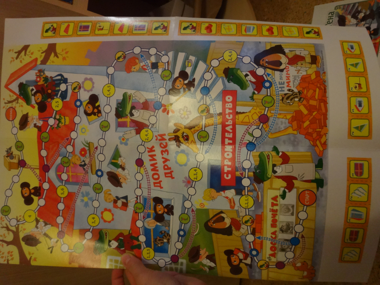 Большие кружочки без цифр , есть там карточки .Их надо вырезать ,но мы пока просто ходим .Придумали сами правило что кружок с Геной это 2 хода , а кружок с крыской -это пропуск хода )