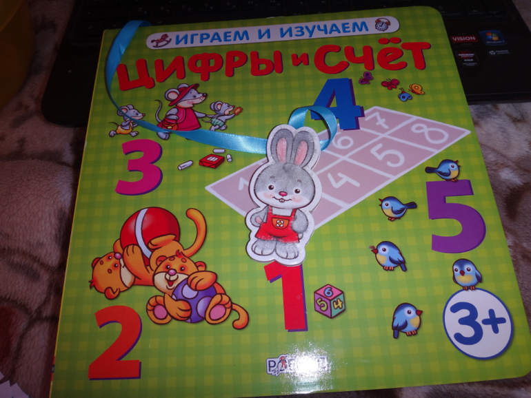 И книжка . с пушистым зайчиком на липучке . Книжка большая из плотного ламинированного картона . Правда не котрые липучки отклеиваются ,пришлось подклеить . Сам зайка пушистый ,на ленточке . Книжка очень интересна , в ней надо выполнять задания : искать и считать предметы .