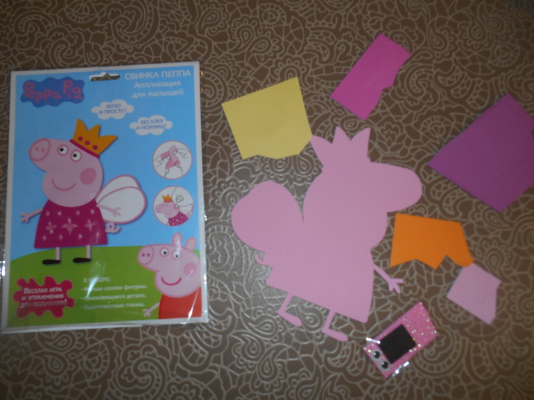В наборе основа свинки пеппы, другие элементы на липкой основе, глаза, листа куда клеить нет, но можно на обратной стороне упаковочной приклеить или куда вам хочется. Качество хорошее. Взяла для младшей, старшей уже слишком легко будет.