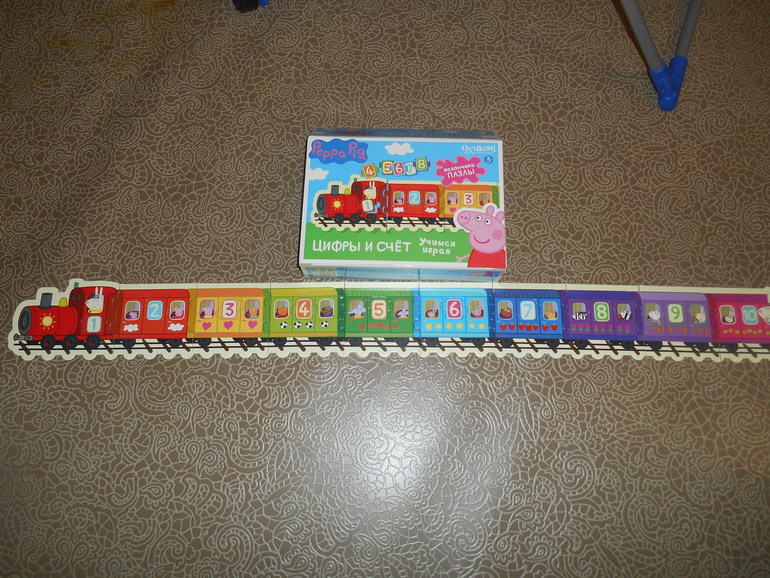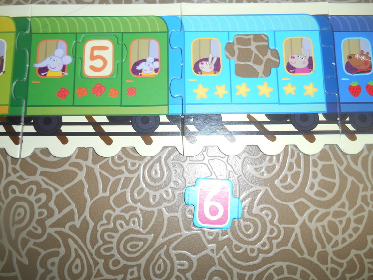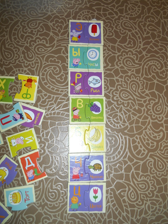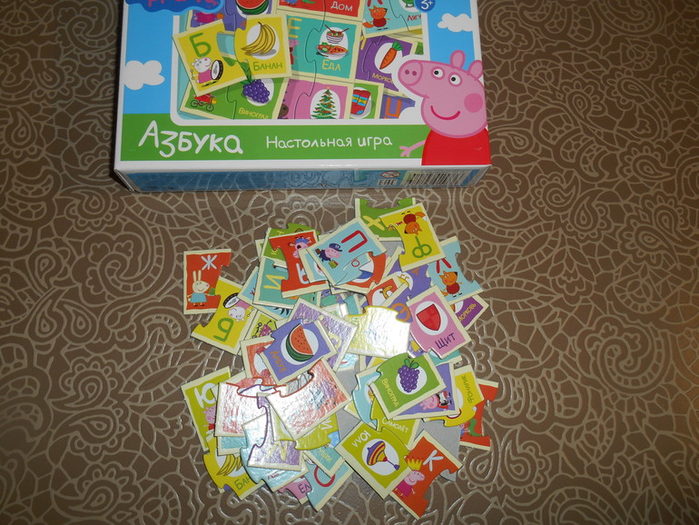 У нас уже есть игры от свинки пеппы. Писала посты про них, скажу, что азбука и набор с паровозом мне понравились больше. Во-первых картон лучше, сцепление и толщина хорошая. На каждой детальке герой мультфильма с буквой, может быть не просто герой, но и с чем нибудь на первый взгляд не приметный начинающимся на ту же букву и вторая деталь, которую нужно подобрать с подходящим изображением. Хорошая тренировка на внимательность. Есть еще подсказка для только начинающих -