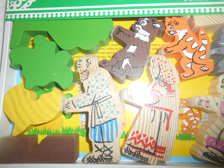 Хороший набор, не вскрывала, но и так видно, что сделано все хорошо, без зазубрин, репка в виде пазла. Понравилось то, что каждого героя можно прицепить друг к другу, т.к есть липучки. Хорошая задумка.