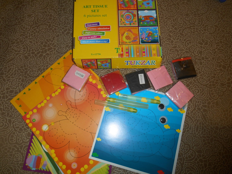 Набор отличный, Оксана показывала Вам такой же набор только там шнурки, а у нас с бумагой. Крутишь, катаешь шарики и приклеиваешь на основу. Я люблю аткие кропотливые штуки детям подсовывать, развивает моторику, усердие, терпение и усидчивость. Картинки хорошие, сами основы большого размера, картонные и ламинированные, очень удивило. Стоит очень дешево, а внутри такое качество. 2300 листочков бумаги, представляете). Думаю даже останется. 3 тюбика клея, 6 основ. И как видно глазки две штуки, в составе на коробке о них ни слова. Повезло?) Ну и сама коробка добротная, большая.