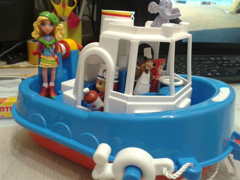 Достался мне наконец . Мы любим купаться ))). Катерок плавает на воде хорошо и главное вместительный пока мы его топим))) Для наглядности сфотографировала с киндеровскими игрушками.