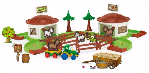 Игровой набор "Конюшня"Игровой набор включает такие элементы, как 1,6 м дороги, 2 автомобиля Kid Cars, 2 хлева для лошадок и фигурки лошадок. Кроме того, в комплект входят яркие элементы для вырезания.