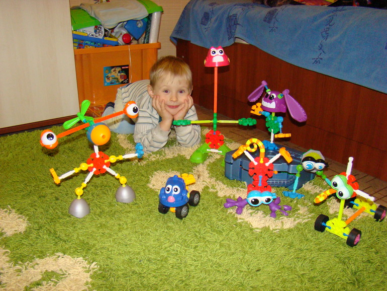 И ещё пару слов о конструкторе. Идея бесподобна конечно. Оригинал конструктора назывался Kid Knex и в России появился весьма эпизодически, я успела прикупить два небольших набора, а потом бесследно пропал. Genius китайский аналог, соотвественно качество пластмасы средненькое. Некоторые детали туговато собираются, но сын справлялся лет с 4 без помощи. Инструкции в комплекте не подробные, просто пример собранного глазастика, расшифровки нет. Поэтому сынок в основном строил сам. Кому интересно в личку назову магазин где есть большой выбор наборов - наткнулась пока искала описание набора на 40 деталей ;).