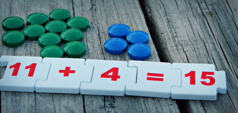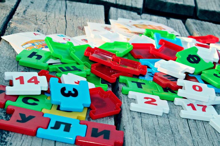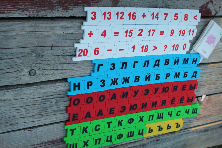 В наборе: карточки с рисунками - 33 штуки, пазлы из пластика с буквами - 70 штук, пазлы из пластика с цифрами - 21 штука, знаки: "=", "-", "+", "?" - по 2 штуки каждый знак.