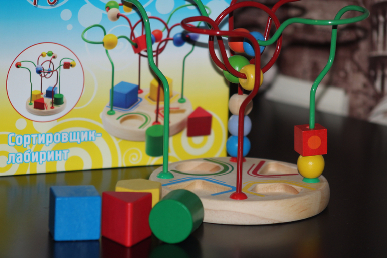 Сортировщик-лабиринт представляет собой комбинацию из нескольких разноцветных проволок, изогнутых в разных плоскостях и закрепленных на деревянном основании. Проволоки нельзя сгибать. На каждой проволоке нанизаны разноцветные деревянные фигурки различной формы.