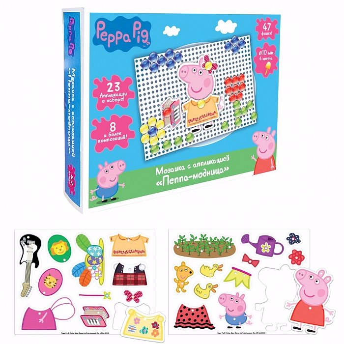 Мозаика с аппликацией "Пеппа-модница"Свинка Пеппа приглашает вашего ребенка отправиться в увлекательное творческое путешествие! С набором малыш составит 8 очаровательных композиций с героями мультфильма "Свинка Пеппа", изображенных на коробочке, и придумает множество собственных сюжетных картинок, по-разному сочетая фишки и аппликации. Для этого в наборе есть 47 фишек 4-х цветов и 23 фигурки-аппликации, которые дают безграничный простор для воображения. Работа с такой мозаикой активно развивает у юного фантазера мелкую моторику, зрительную и тактильную память, внимательность, творческие способности, воображение и усидчивость. А главное - дарит ни с чем не сравнимое удовольствие от создания новых поделок.