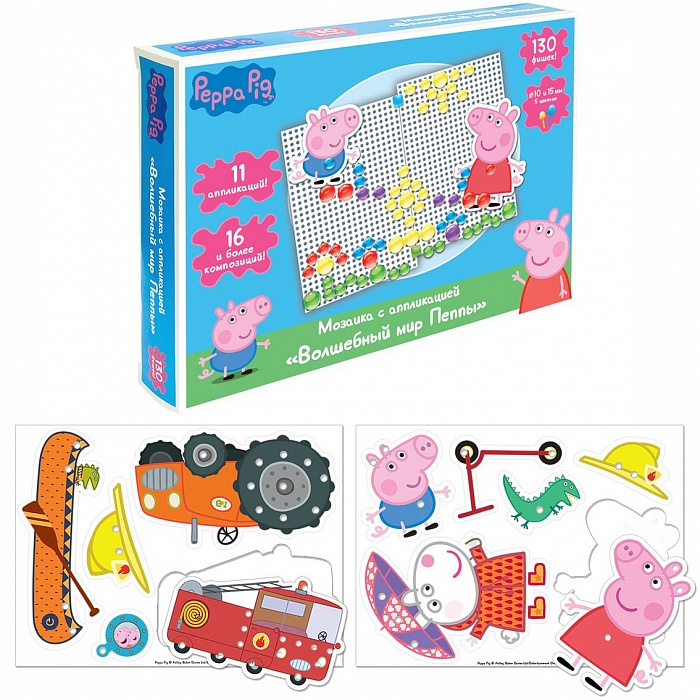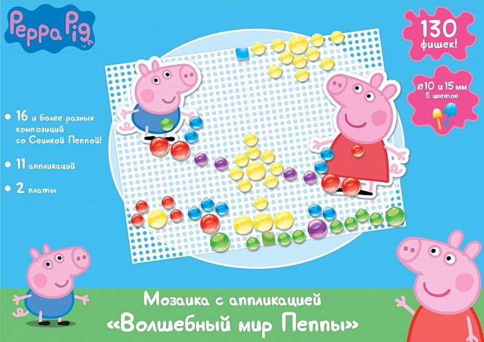 Мозаика с аппликацией "Волшебный мир Пеппы"Свинка Пеппа приглашает вашего ребенка в увлекательное творческое путешествие! С набором "Волшебный мир Пеппы" малыш составит 16 очаровательных композиций с героями мультфильма "Свинка Пеппа", изображенных на коробочке, и придумает множество собственных сюжетных картинок, по-разному сочетая фишки и аппликации. Для этого в наборе есть 130 разноцветных фишек и 11 фигурок-аппликаций, которые дают безграничный простор для воображения. Работа с такой мозаикой активно развивает у юного фантазера мелкую моторику, зрительную и тактильную память, внимательность, творческие способности, воображение и усидчивость. А главное - дарит ни с чем не сравнимое удовольствие от создания новых поделок.