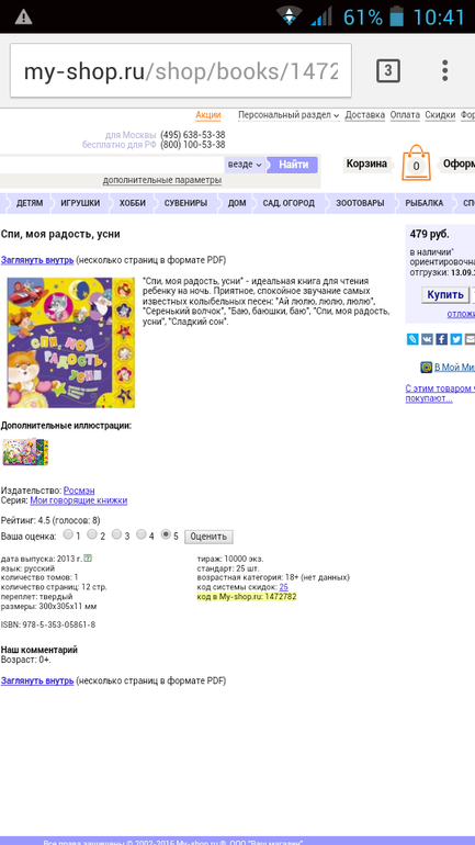 Спи, моя радость, усни"Спи, моя радость, усни" - идеальная книга для чтения ребенку на ночь. Приятное, спокойное звучание самых известных колыбельных песен: "Ай люлю, люлю, люлю", "Серенький волчок", "Баю, баюшки, баю", "Спи, моя радость, усни", "Сладкий сон".