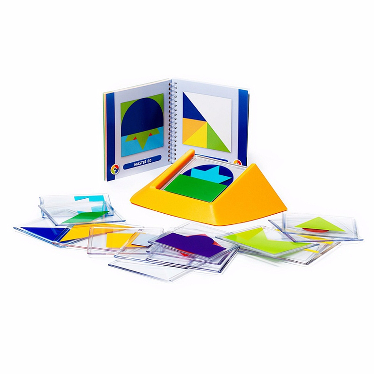 Перед Вами лежит картинка с изображением разноцветных геометрических фигур. Задача малыша - это составить из отдельных карточек точно такую же картинку, при этом карточки нужно накладывать друг на друга. Придется немного подумать, а мама или папа всегда готовы помочь.