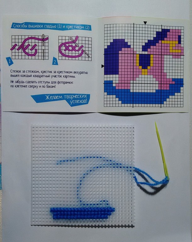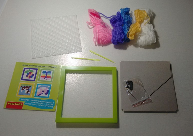 Прелесть данного набора в том, что вышивать надо по пластиковой канве, что значительно легче для ребенка чем по ткане, сама картинка не большая (12х12 см), поэтому у ребенка есть стимул ее быстрее закончить.