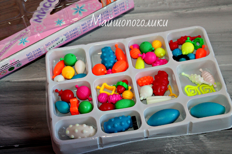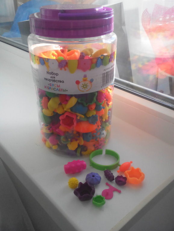Брала этот набор на пробу интересна сама суть бусы без ниток ...собирается как конструктор но очень девчачий! В целом набор неплохой пластик плотный и яркий, но цвета настоящие не кислотные...запаха нет, как вышло набор в ассортименте...нам пришел не такой как на фото. Скрепляются бусинки довольно плотно ..но наверно так и должно быть чтобы потом они не рассыпались! А еще бусины довольно крупные. Дочери не показывала но мне кажется она точно оценит!!!!!!!