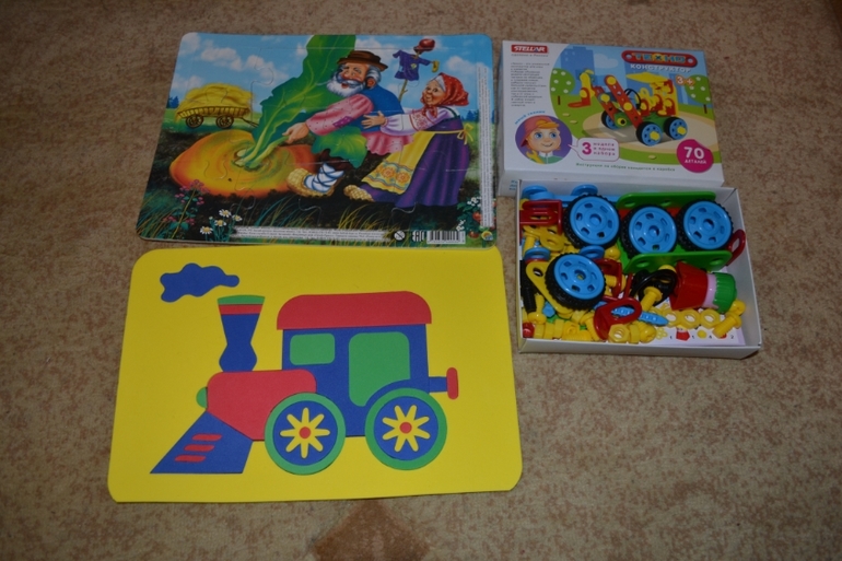 Паровозик(мягкие пазлы) очень тонкие и разваливаются,как и пазлы репка.Конструктор оказался очень мелким.