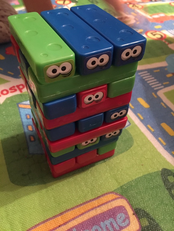 Ах да, кстати, блоки плохо держатся в башне, крайние все время норовят упасть при укладывании, кажется, если бы они не были полыми, держались бы лучше. Интересно, как в другой малышковой Дженге с червячками. Есть в май шоп вроде еще одна похожая, и вроде есть в Имаджинариуме.