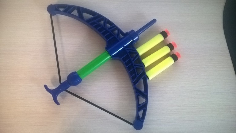 Сия конструкция называется "Лук и стрелы". Пульки мягкие, с присосками. В наборе три штуки. Одеваем на штырь, оттягиваем до отказа ручку и отпускаем. Ход у поршня легкий, ребенку справиться как нечего делать. Сынуля пока в саду, еще не видел, так что сижу сама развлекаюсь. )) Пульки, кстати, отлично присасываются к стеклам.