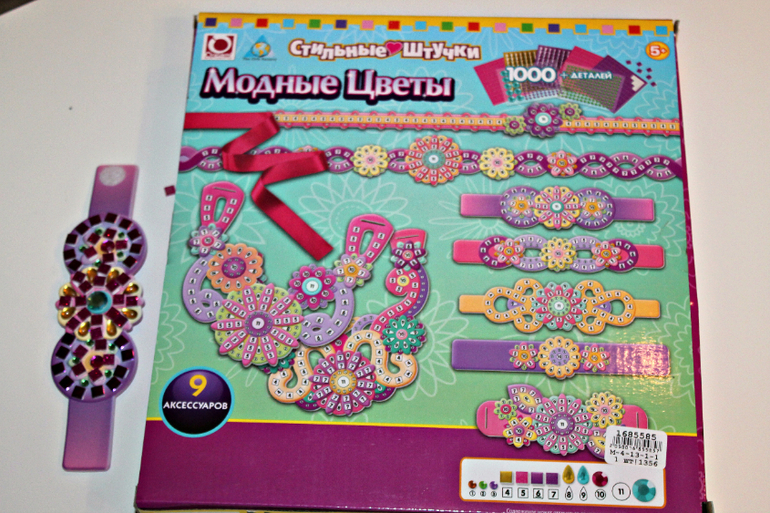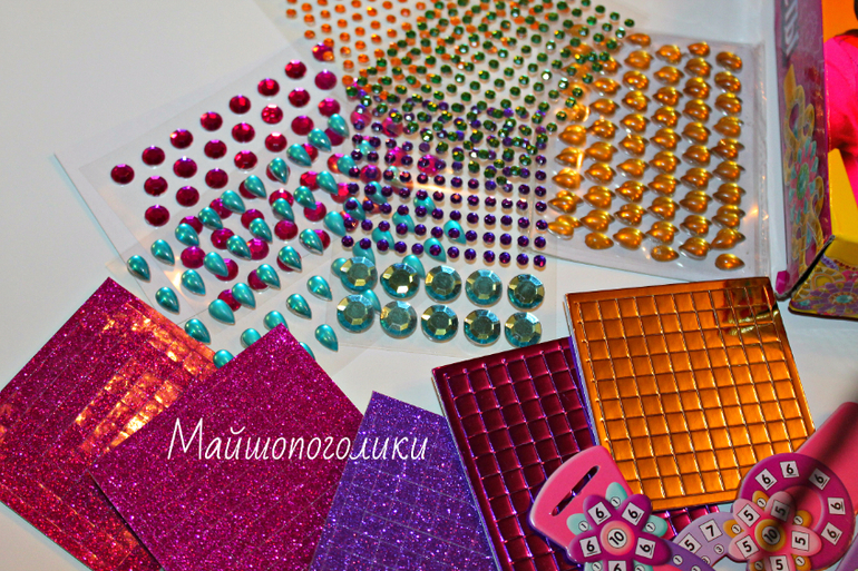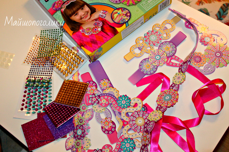Это что то потрясающее! Во первых я не ожидала что это такая большая коробка и что всего так много! Состав набора: 2 подвески, 5 браслетов, 2 пояса и ленточки и очень много страз и блестяшек!!!!!!!