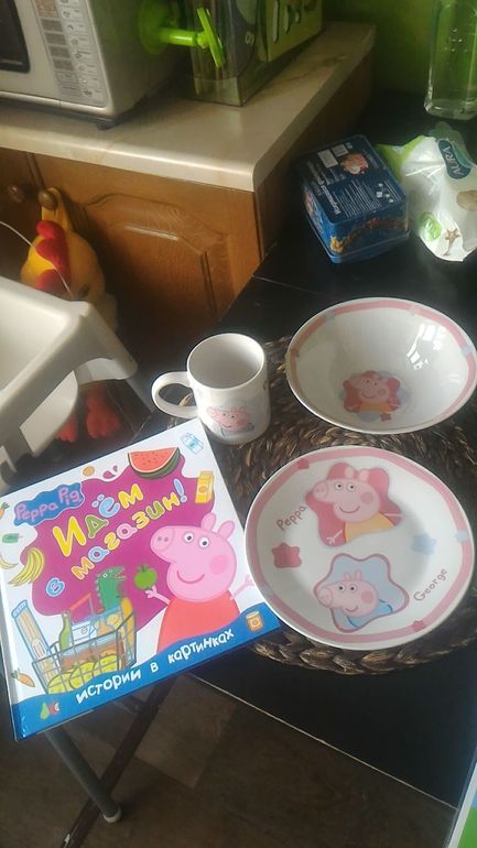 так как Ева фанат Пеппы, заказала ей новую посуду. Керамика, написано, что можно греть в свч, мыть в посудомоечной машине. Пока не мыла, не знаю как поведут себя картинки. Очередная книжка про Пеппу.