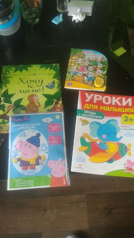 наклейки. Набор для апликацти, брала такую с Пеппой в прошлый раз, очень понравилась. И книжки еще. Хочу к маме, Ева как-то не оценила, а волк и семеро козлят -это наш хит теперь! Целый день читаем!