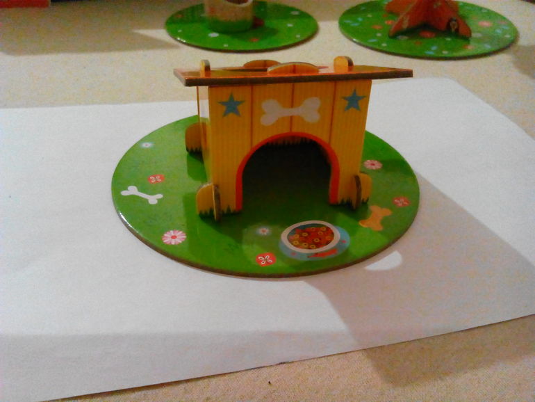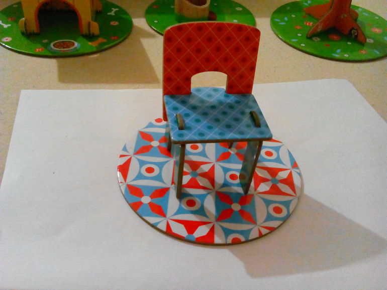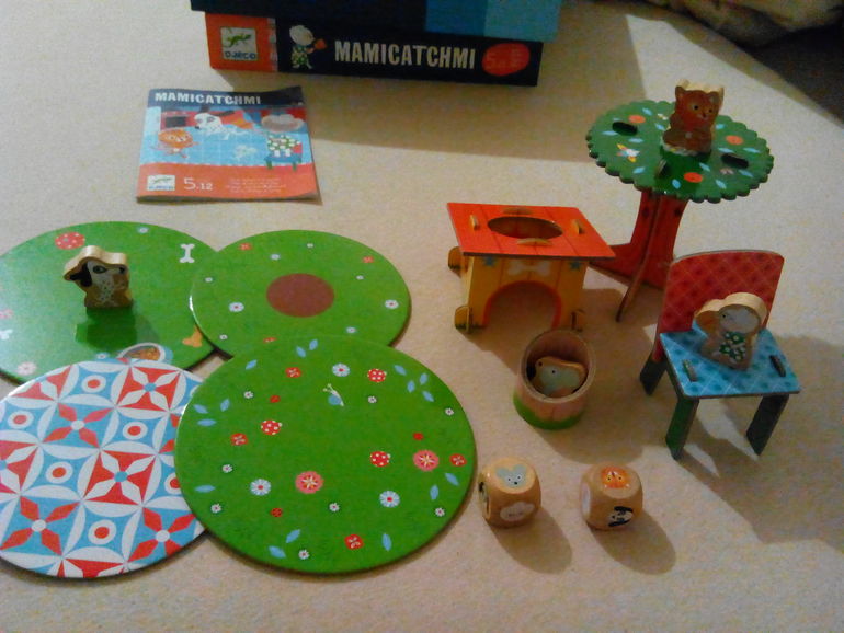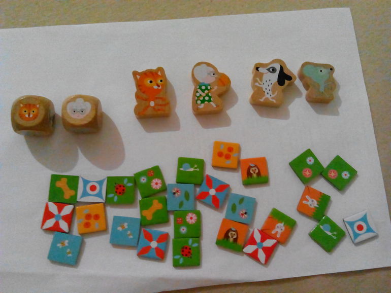 В наборе стульчик бабушки, домик собаки ,норка мышки и дерево для кошки , 2 кубика 2,5*2,5 , 4 фишки деревянных бабушка,мышка,кошка,собака и 26 жетонов