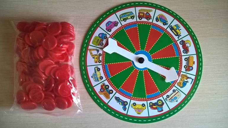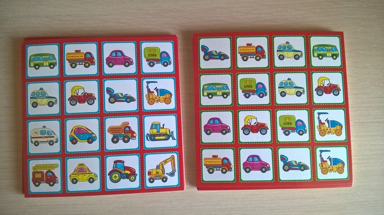 Карточки двух видов. С синими и зелеными рамочками. На синих машинки не повторятся, за зеленых по две одинаковых. Играть с одной карточкой не интересно, надо брать сразу несколько. Иначе, когда бОльшая часть машинок закрыта, стрелку приходится крутить в холостую и это раздражает.