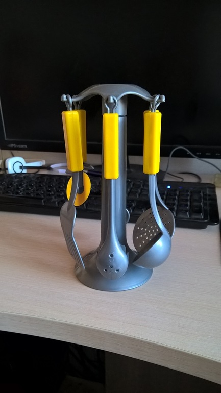 Немного аксессуаров для игровой кухни. В наборе: шумовка, половник, лапшеловка, лопатка, пицца-нож, лопатка для соуса, подставка. Хороший набор и хороший размер приборов.