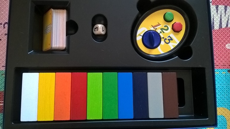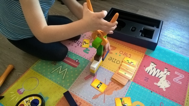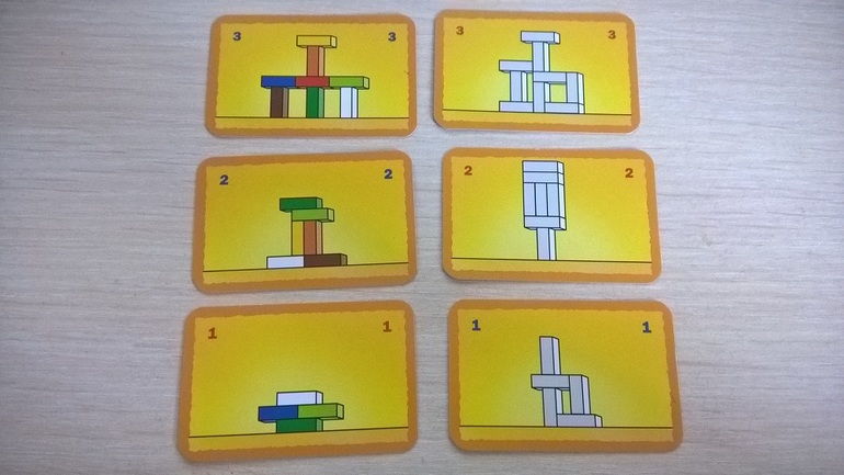 Таймер не использовали, т.к. он отвлекает от игры своим скрипом. Карточки двух видов, с цветными блоками и серыми. То есть собирать нужно по цветам или составить конструкцию из любых.