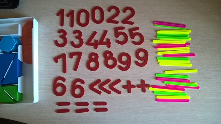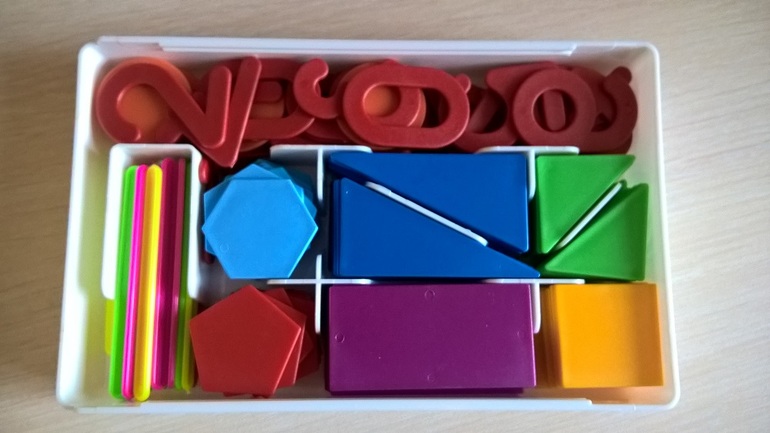 В наборе: прямоугольник, квадрат, шестиугольник, пятиугольник, круг по 10 штук, треугольники 30 и 45 градусов, по 20 штук, цифры и знаки - 32 штук, счетные палочки 20 штук.