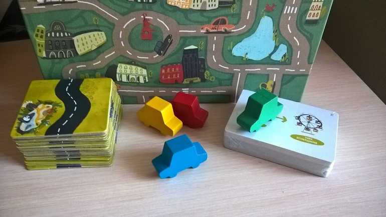 В наборе игровое поле со стрелкой и фишки. На поле 16 машинок, также как и на карточках.