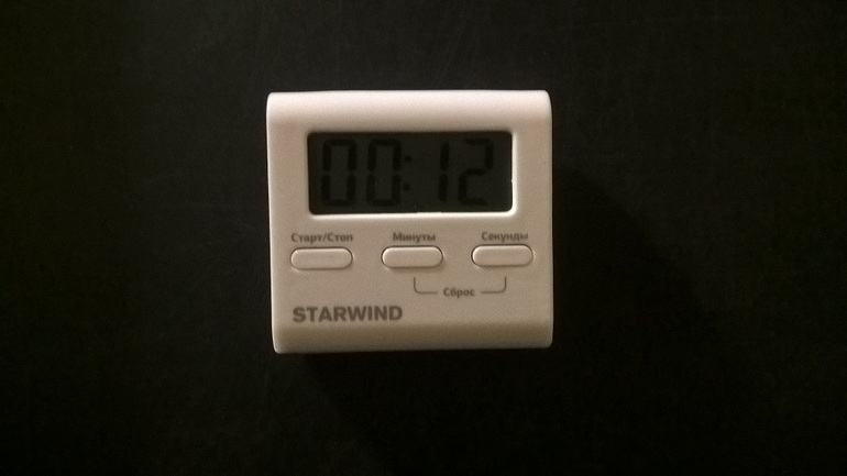 Маленькая пластиковая коробочка, которая умещается в руке. Обошелся что-то около 100 рублей. Работает от одной батарейки. Может стоять на подставке или висеть на холодильнике (с обратной стороны магнит). Удобно, однако. Одна беда, не отключается. Посмотрим на сколько хватит батарейки. Максимальное время таймера - 99 мин 59 сек. Может работать и как секундомер.