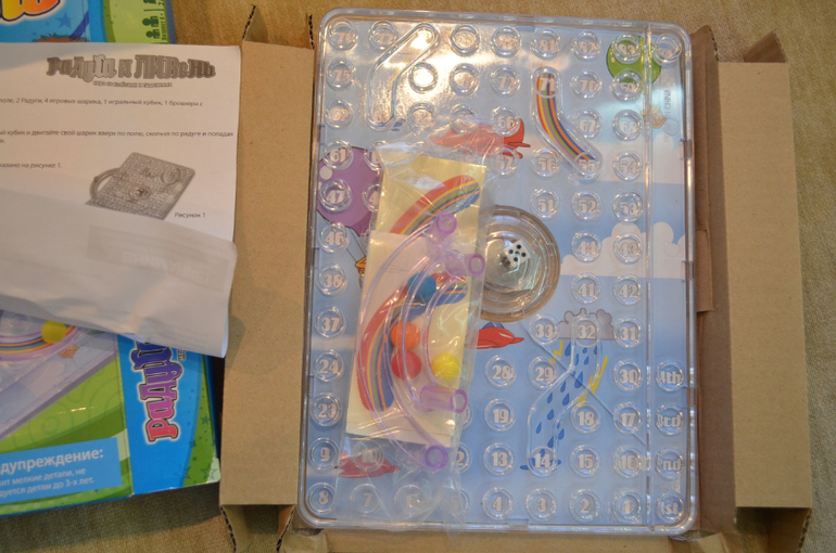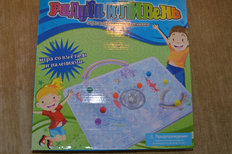 Очень была рада, что словила по хорошей цене(126р) Настольная игра "Радуга и ливень", пока не распаковала коробку и не увидела трещину. Но сама игра интересная, особенно удивил необычный встроенный кубик)