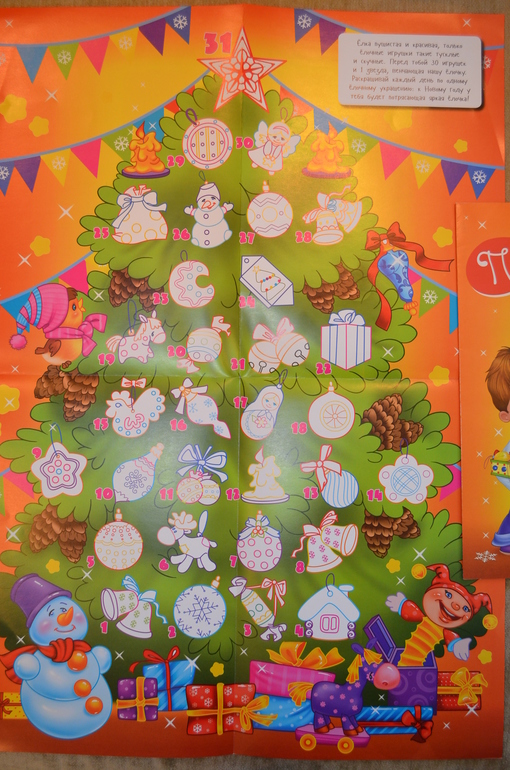 Купила на следующий год Пушистая елочка. Книжка-плакат. Календарь ожидания Нового года, пока есть в наличии, там нужно 31 день раскрашивать по 1 елочной игрушке, на обратной стороне несколько заданий