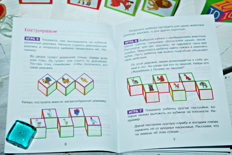 Выполняя игровые задания, ребёнок учится конструировать, систематизировать, ищет сходства и различия; осваивает количественный счёт, решает и составляет элементарные математические задачи; получает навык определения положения предмета в пространстве, тренирует память и внимание, развивает воображение и речь. Игровой комплект включает: 12 кубиков с цветным изображением животных и методическое пособие с подробным описанием 50 развивающих игр. Чтобы познакомить ребёнка с разными способами подачи информации, задания даются в виде модели, устной инструкции или схемы и постепенно усложняются. Простота и удобство комплекта позволяют использовать его в детском саду, дома и на отдыхе. Предназначен для детей старше 3-х лет.