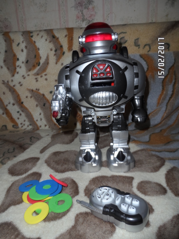 На 23 февраля сыну, робот прикольный. Ходит, стреляет мягкими дисками, говорит несколько фраз на русском. Сын второй день играет и очень доволен.