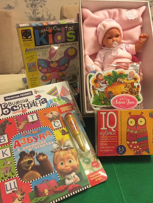 Для дочки в подарок купили маленького хуанчика, кубики http://my-shop.ru/shop/products/2160012.html (давно на них засматриваюсь, но все казалось рано, а сейчас должно заинтересовать), различные наборы для творчества.