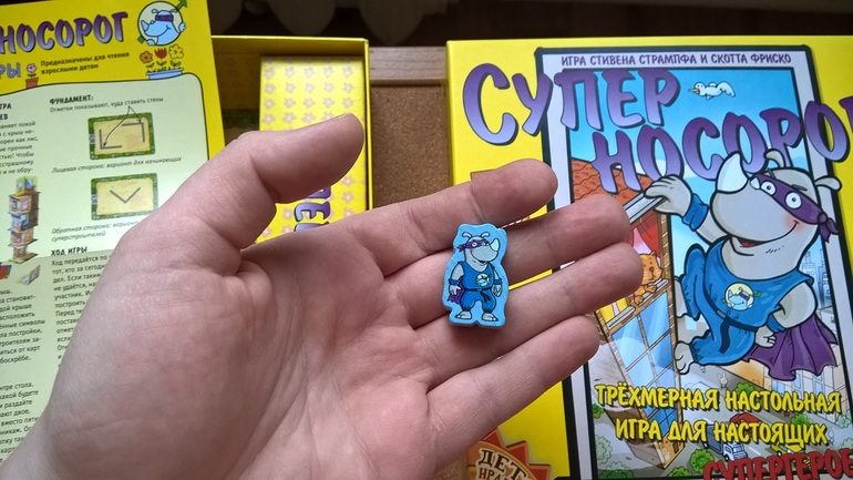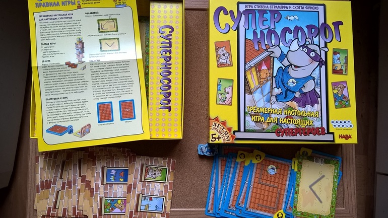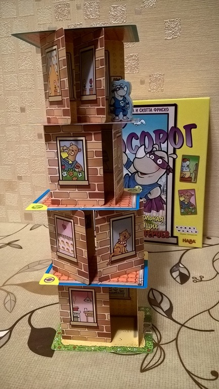Трехмерная настольная игра на ловкость, где нужно построить небоскреб и не уронить его под весом носорога. На картах-крышах указано направление размещения карт-стен. Игра заканчивается, когда один из игроков поставил последнюю крышу или когда небоскрёб обрушился. Я не ребенок, но мне идея очень понравилась. Так что от 5 лет и до ... бесконечности.