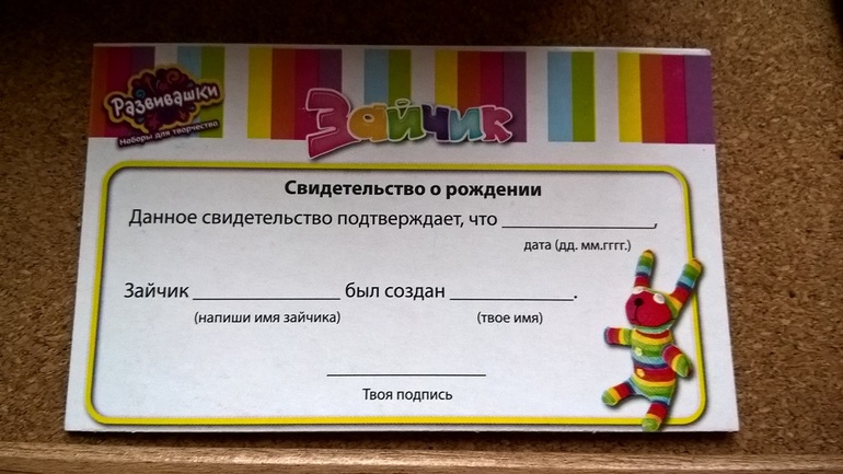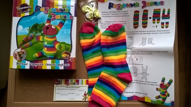 Пополнение в нашей семье зайцев. )) В наборе два настоящих радужных носка. Я почему-то думала, что там выкройка уже.