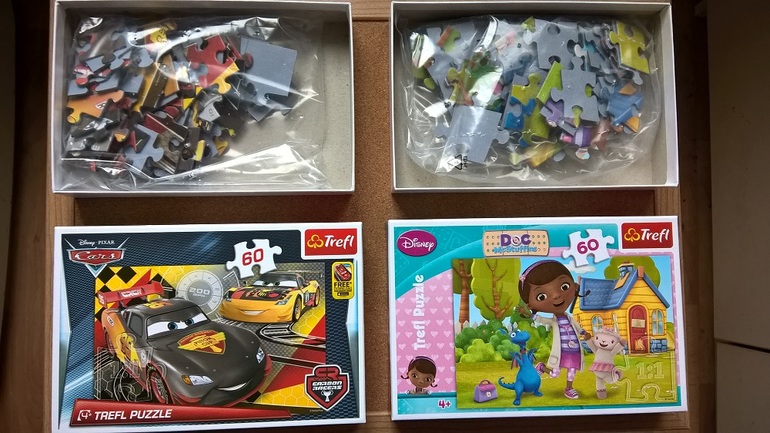 Два пазла по 60 элементов от Trefl. Первый раз взяла эту фирму. Пазлы отличные. Детальки ровненькие. Собранный можно поднять руками, не рассыпается.