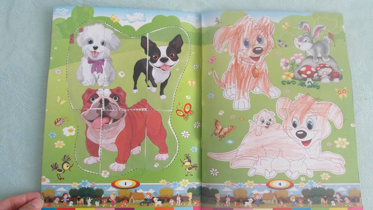 5. Домашние любимцы. Книжка-раскраска-вырезалка сочетает в себе разукрашку, вырезание, аппликацию с элементами пазла. Купила сыну, т.к. он любит всякие аппликации, и уже более-менее прилично вырезает ножницами. Сын доволен!