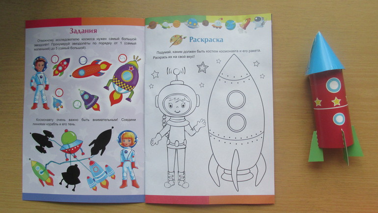 6. Звездное небо. Книжка-вырезалка тоже была куплена из-за вырезания и самостоятельного изготовления аппликаций, ну и заодно ко дню космонавтики. В книге кроме того есть задания для выполнения. Мы уже почти все сделали и собрали ракету