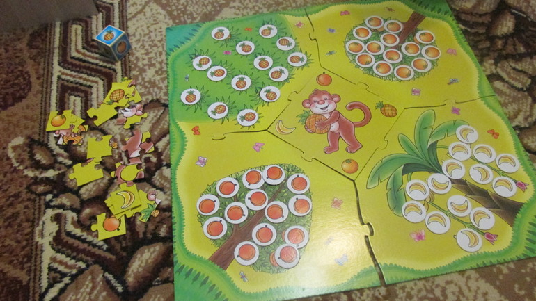 Принцип игры: кидаем кубик и собираем с деревьев соответствующие фрукты. Если на кубике выпадает пустая корзинка, ничего не берём. Если выпала обезьянка, выкладываем одну деталь пазла. Нужно успеть собрать все фрукты с дерева до того, как обезьяна пришла в наш огород собран весь пазл "обезьянка". А в конце игры, если обезьянка не успела, считаем наш урожай. У кого больше, тот и выиграл. Просто и весело.