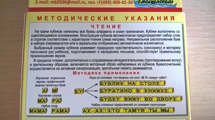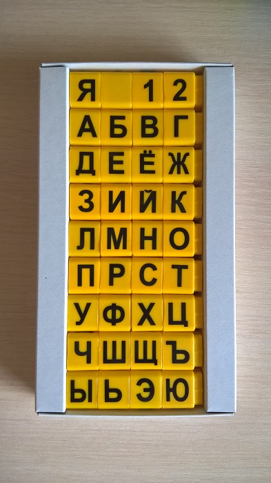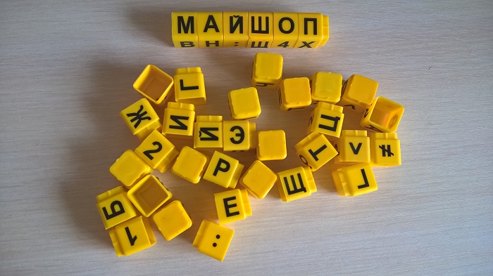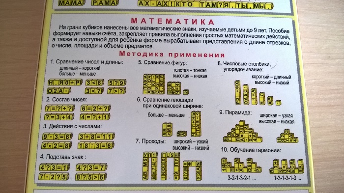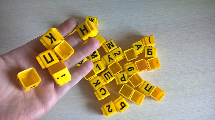 Комплект представляет собой набор из 36 кубиков, на гранях которых написаны буквы русского алфавита, знаки препинания, цифры и знаки математических действий.