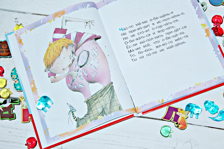 А мне не нравится разбиение на слога через черточки. Текст сливается в один длинный поезд с вагончиками. У нас таких книг не было. По мне дуги под словами намного лучше. Ребенок видит сразу все слово и разбиение на слоги присутствует.