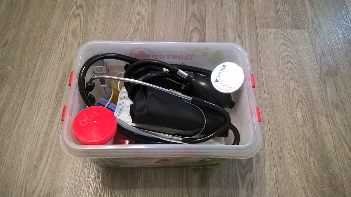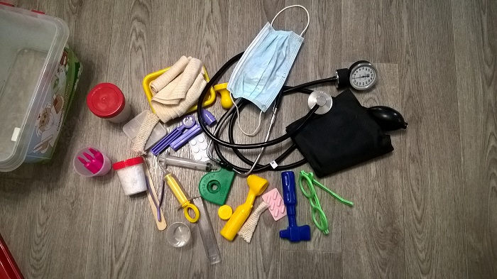 Для игр у нас настоящие стетоскоп с тонометром. Градусник, тоже настоящий. А также контейнеры, марлевая повязка, различные бинты, шприцы, палочка для горла. И куча важной мелочевки оставшаяся от двух наборов доктора. Был еще йод в карандаше, слава богу закончился. Погорячилась я когда отдала его ребенку. Пришлось очень долго ходить разрисованной. ))