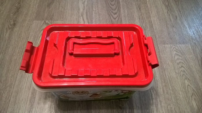 У контейнера одна удобная ручка на крышке и два фиксатора по бокам. Фиксаторы несколько туговаты, но ребенок сам прекрасно справляется.